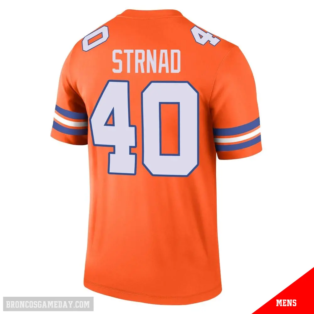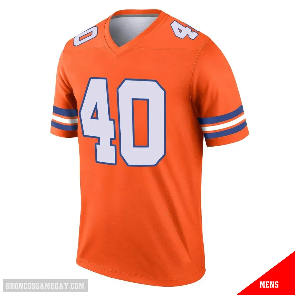 Display your Broncos spirit year-round with this #40 Men's Justin Strnad Orange Legend Denver Broncos Alternate Mile High Collection 1977 Throwback Jersey. Whether you're in the crowd or lounging at home, it's the ideal way to showcase your love for Broncos.