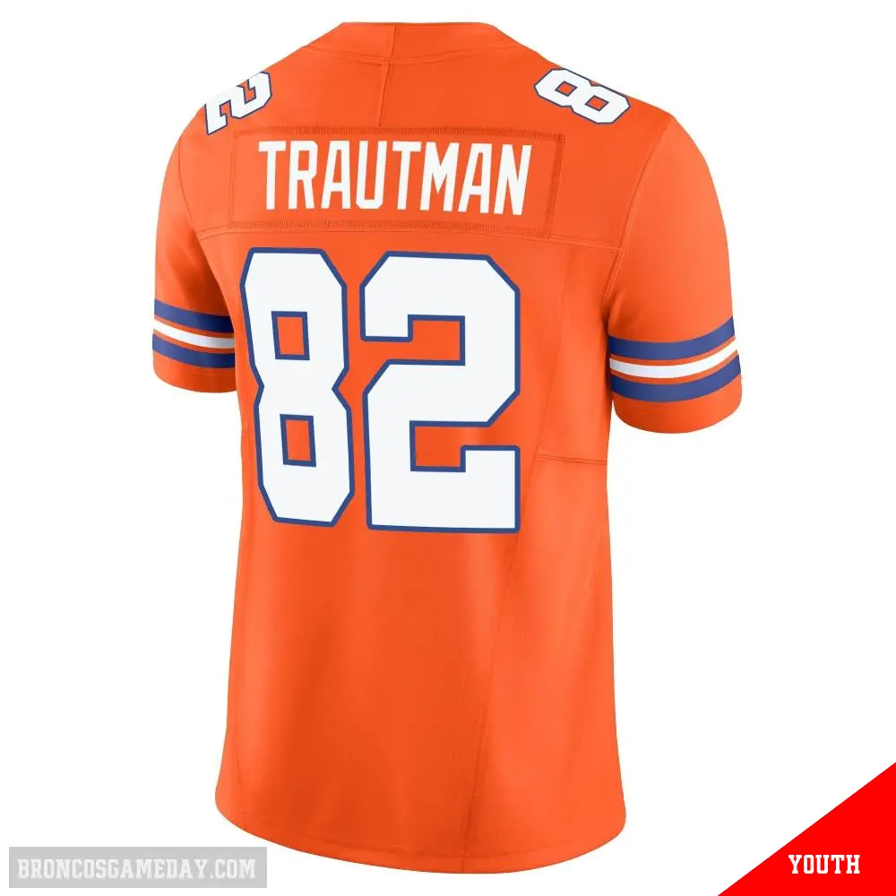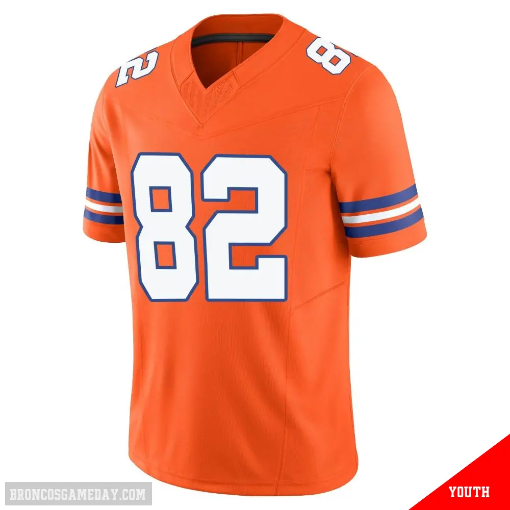 Display your Broncos spirit year-round with this #82 Youth Adam Trautman Orange Limited Denver Broncos Alternate Vapor F.U.S.E. Mile High Collection 1977 Throwback Jersey. Whether you're in the crowd or lounging at home, it's the ideal way to showcase your love for Broncos.